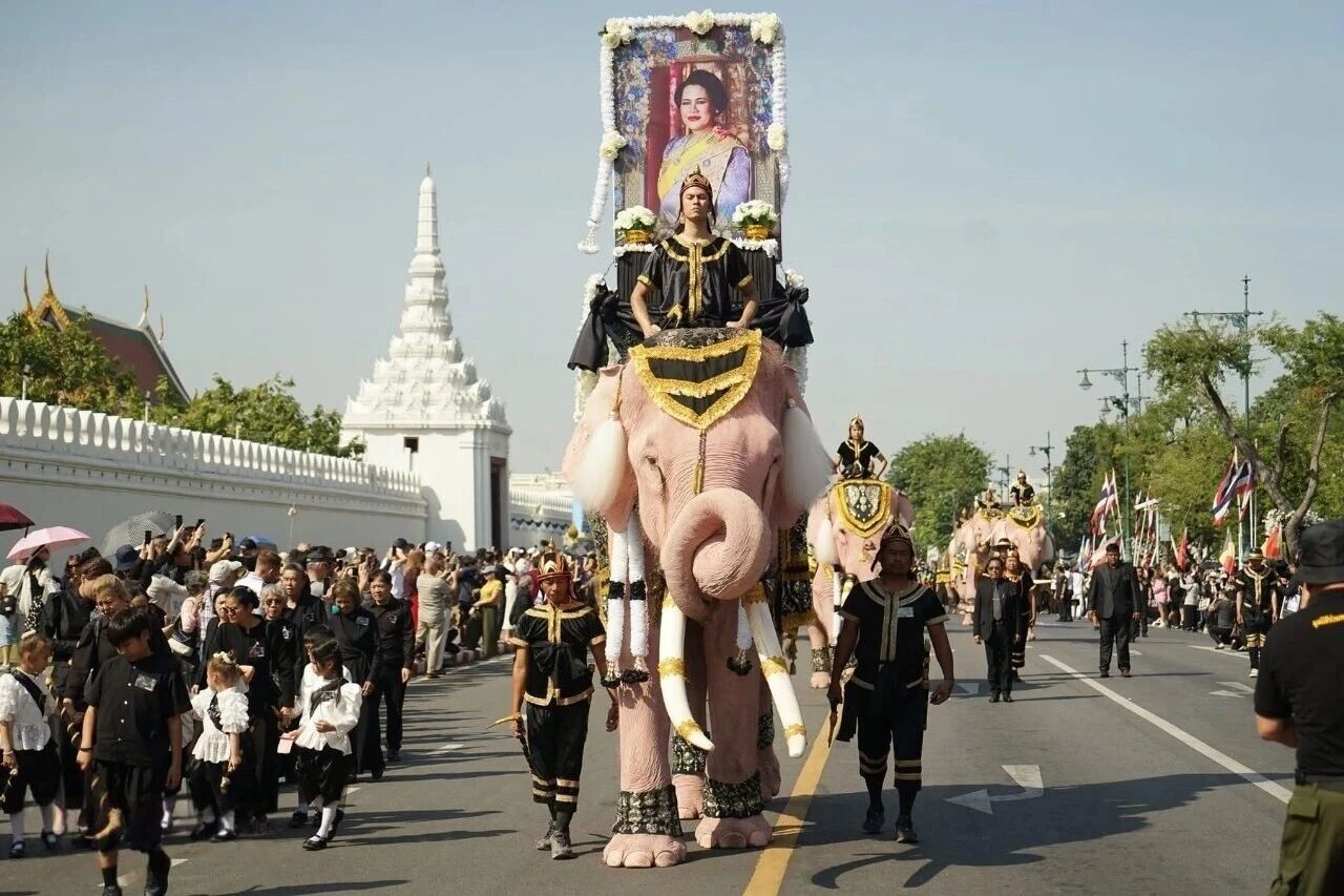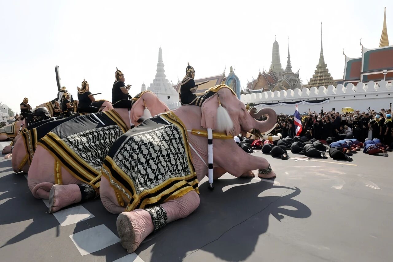 这11头大象被涂成淡粉色,象征着吉祥。在象夫引导下,它们缓缓走过大皇宫,集体跪地,默哀93秒,以此象征诗丽吉93年的生命历程。