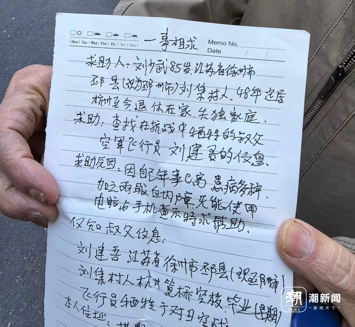 半晌,他取下老花镜,泪眼婆娑:“我想找二叔刘健吾,他是一名飞行员,在抗战中牺牲了。找到二叔的消息,是我一辈子的心愿,也是我母亲的遗愿。”