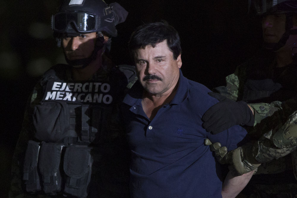 2016年1月8日晚,在墨西哥首都墨西哥城,士兵押送大毒枭华金·古斯曼。新华社发(亚历杭德罗·阿亚拉摄)