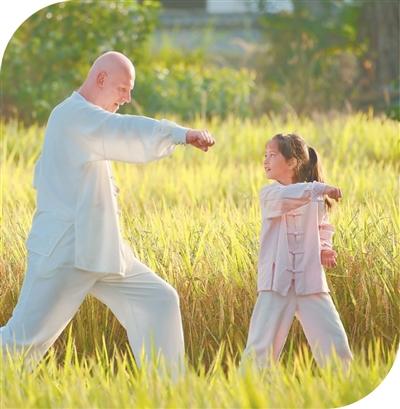 Armin, owner of Alina's Garden Resort, practices tai chi with his daughter Alina in front of his B&B in Yixian county, Huangshan, east China's Anhui Province. (Photo courtesy of Alina's Garden Resort)