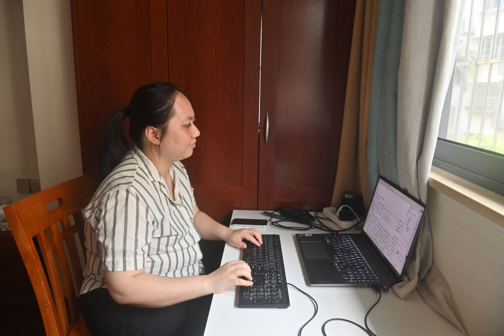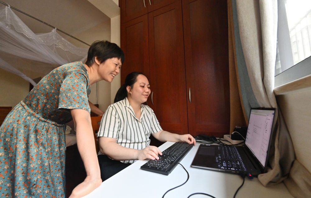 2025年8月13日,李莹(右)在妈妈的帮助下校对文稿。