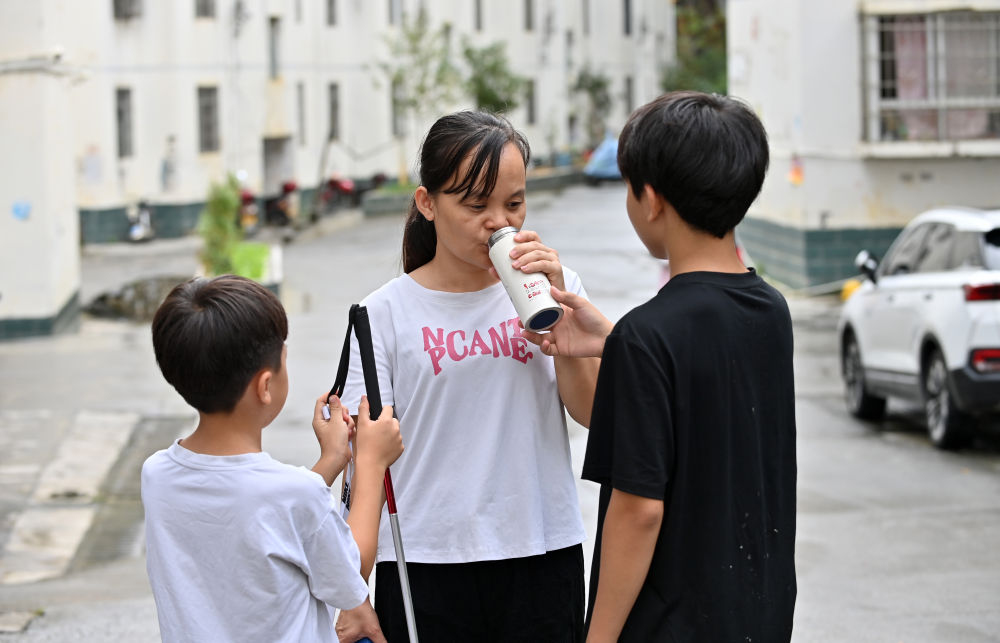 2025年10月14日,蓝野针和两个儿子在散步时喝水。