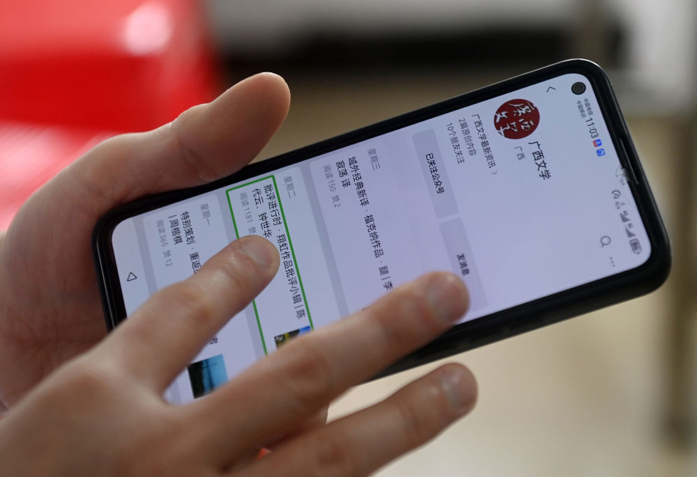 2025年8月13日,李莹在广西南宁市的家中通过手机软件听文学作品。