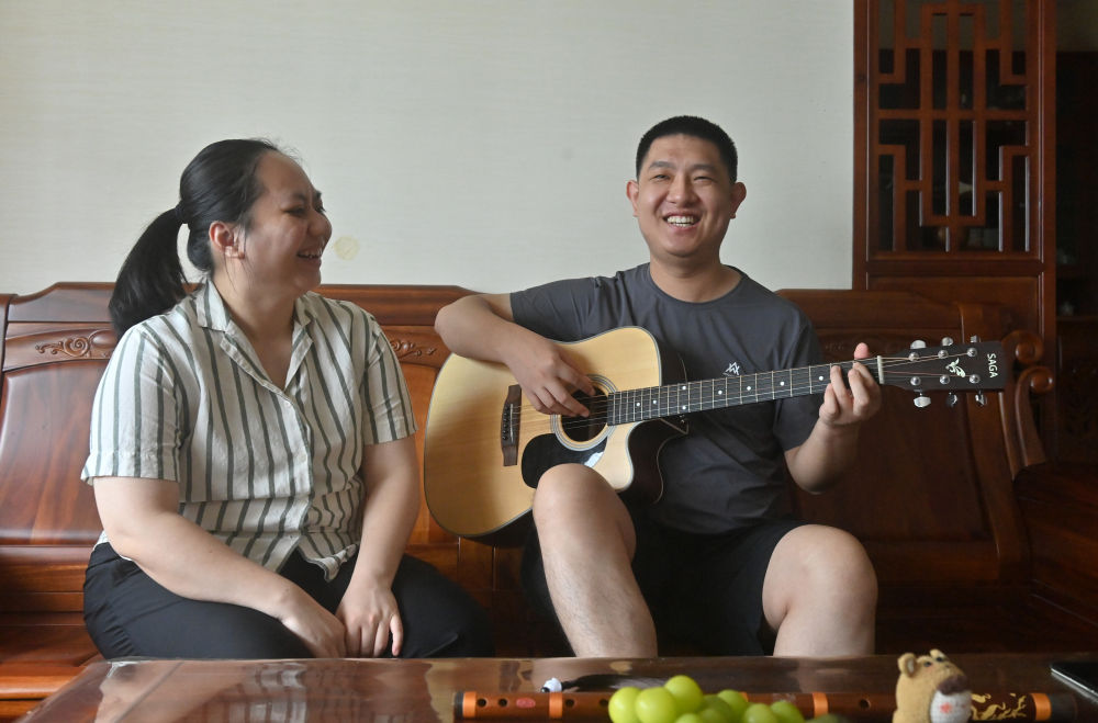 2025年8月13日,李莹(左)听爱人邵学明弹唱乐曲。邵学明是一名低视力视障人士。