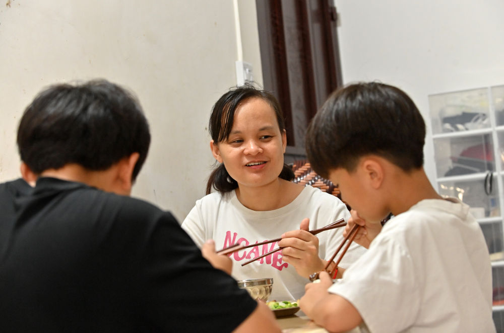 2025年10月13日,蓝野针陪着小儿子复习功课。