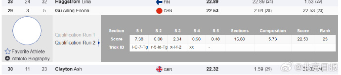 当地时间11月20日,国际雪联坡面障碍技巧世界杯斯图拜站进行了女子资格赛的角逐,这也是谷爱凌伤愈复出后在2025至2026赛季的首次亮相。比赛中,她两轮分别得到2.94分和22.53分,最终位列第29名,未能晋级决赛。