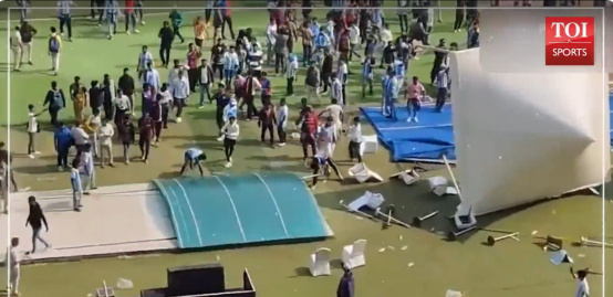 当地时间13日,梅西提前离场后,球迷在场内扔东西、破坏球场。图源:《印度时报》