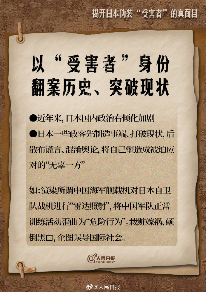 以“受害者”为借口发动侵略战争、用“受害者”谎言炮制虚假叙事、以“受害者”身份翻案历史突破现状…日本正在穷兵黩武道路上越走越远,这些危险动向值得高度警惕:一个热衷于在舆论场搅浑水的日本,其危险性不会仅停留于舆论层面,背后是蠢蠢欲动的军国主义。