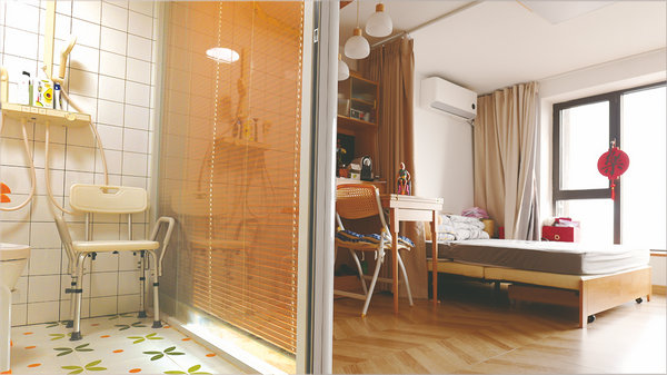 (From left to right) A bath bench is placed beneath the shower in the accessible bathroom. In the bedroom, the bed height can be adjusted by adding or removing mattresses to accommodate different needs. [Photo provided to China Daily]
