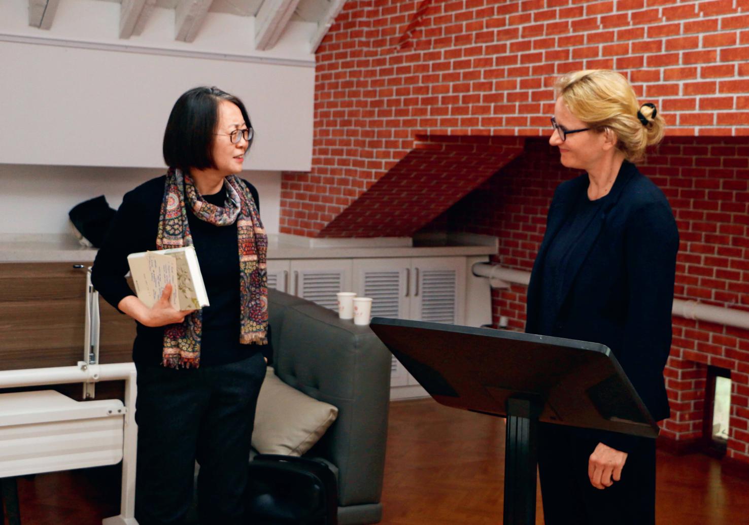 2024年11月,德国柏林洪堡大学德语文学系教授克劳迪娅·施托金格到北大做讲座,谷裕(左)主持。(受访者供图)