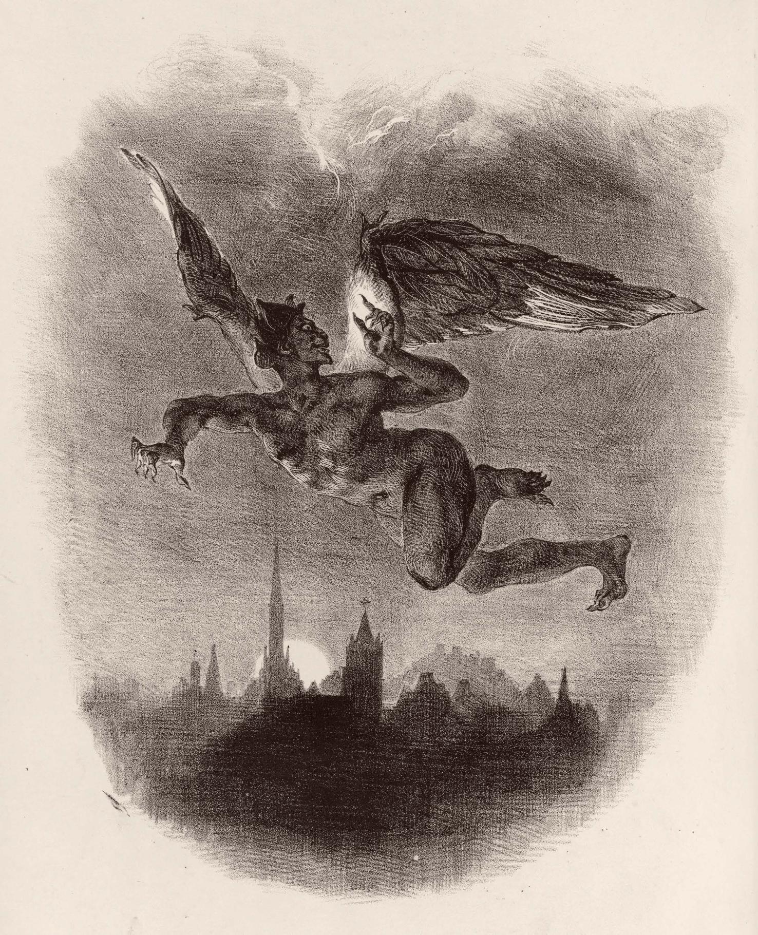 1828年,法国插画家阿尔伯特·斯塔普弗为《浮士德》法文译本创作的插画。图为魔鬼梅菲斯特在夜晚飞过城市上空。(视觉中国)
