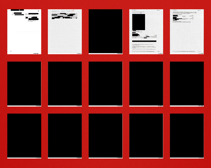 《卫报》汇编了美国司法部公布的爱泼斯坦案相关文件中的被涂黑页面。图源:《卫报》报道配图