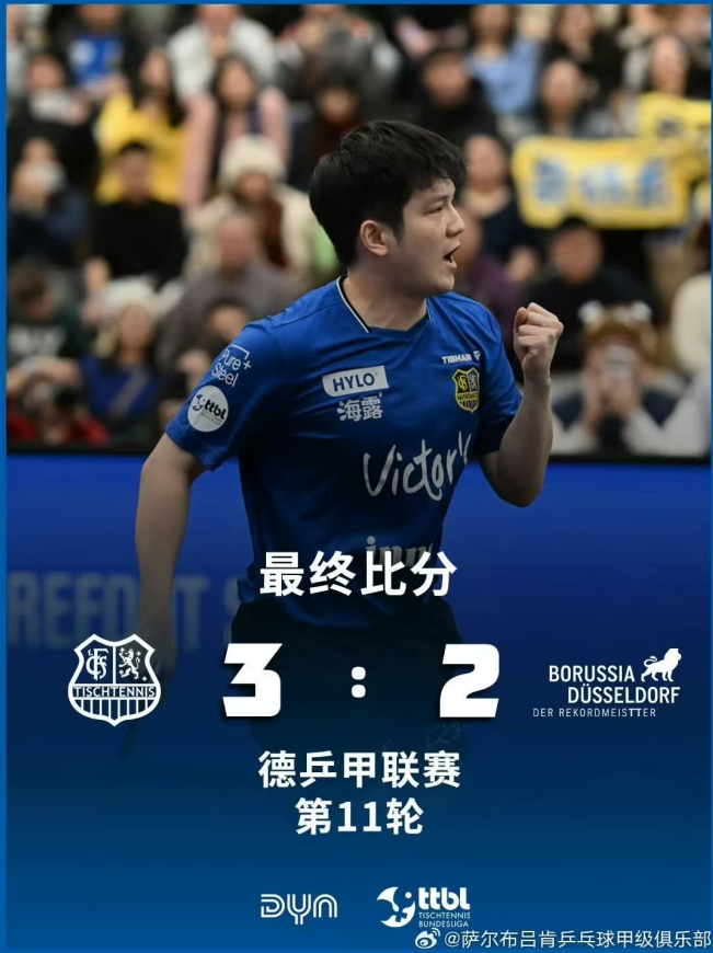 当地时间2025年12月22日,萨尔布吕肯俱乐部以3:2战胜杜塞尔多夫俱乐部。萨尔布吕肯乒乓球俱乐部官方微博