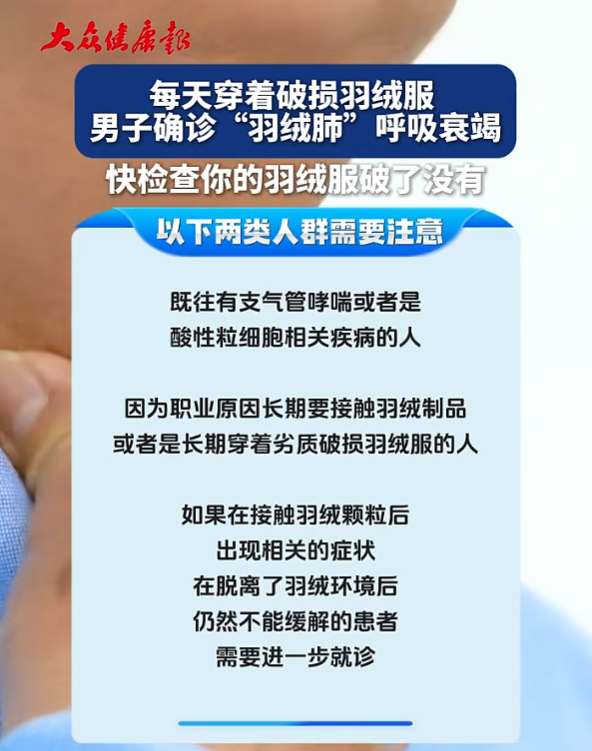 福建省人民医院专家接受采访时指出,羽绒中微小的蛋白颗粒被持续吸入肺泡后,即便对非过敏体质者,也可能引发免疫反应并攻击肺组织,因此这类问题也被俗称为“羽绒肺”。