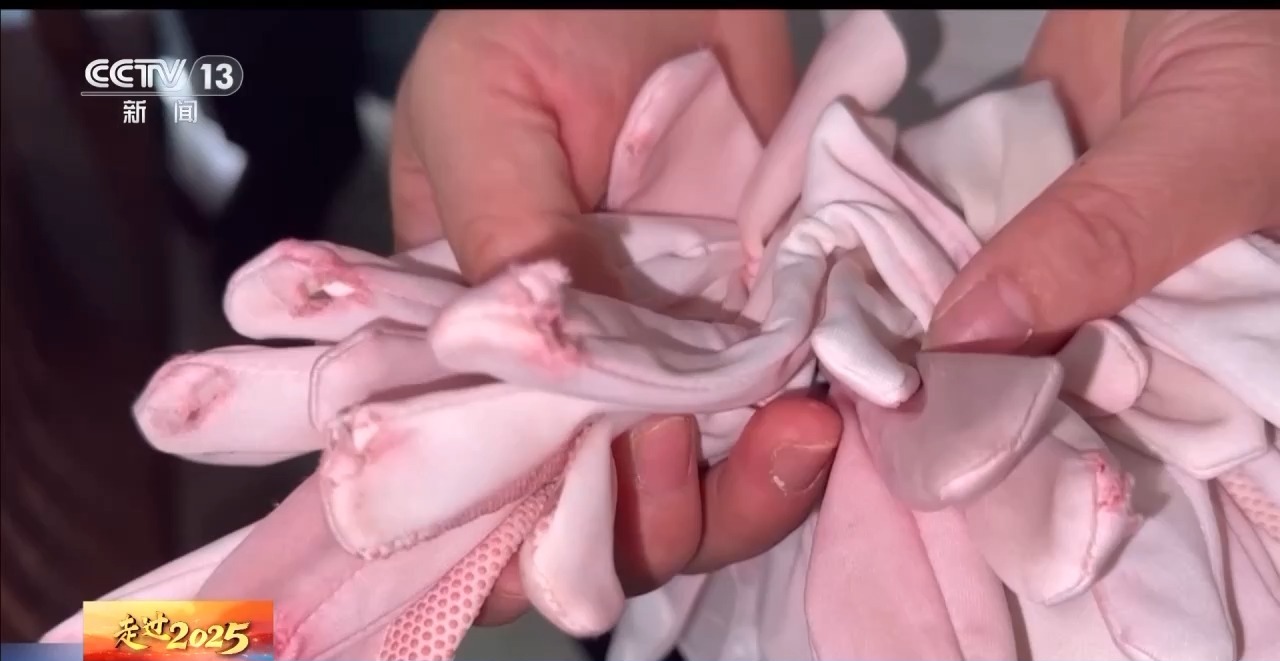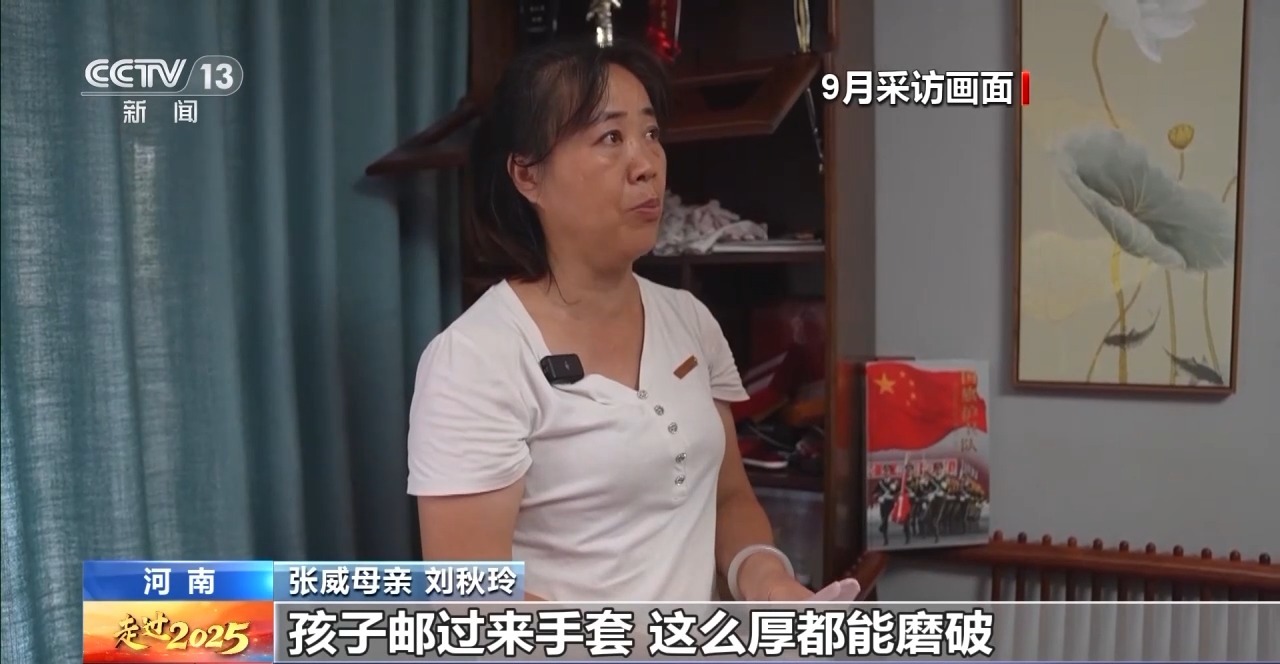 张威母亲 刘秋玲:孩子邮过来手套,这么厚都能磨破,看孩子训练有多苦吧,很心疼孩子,也支持孩子。