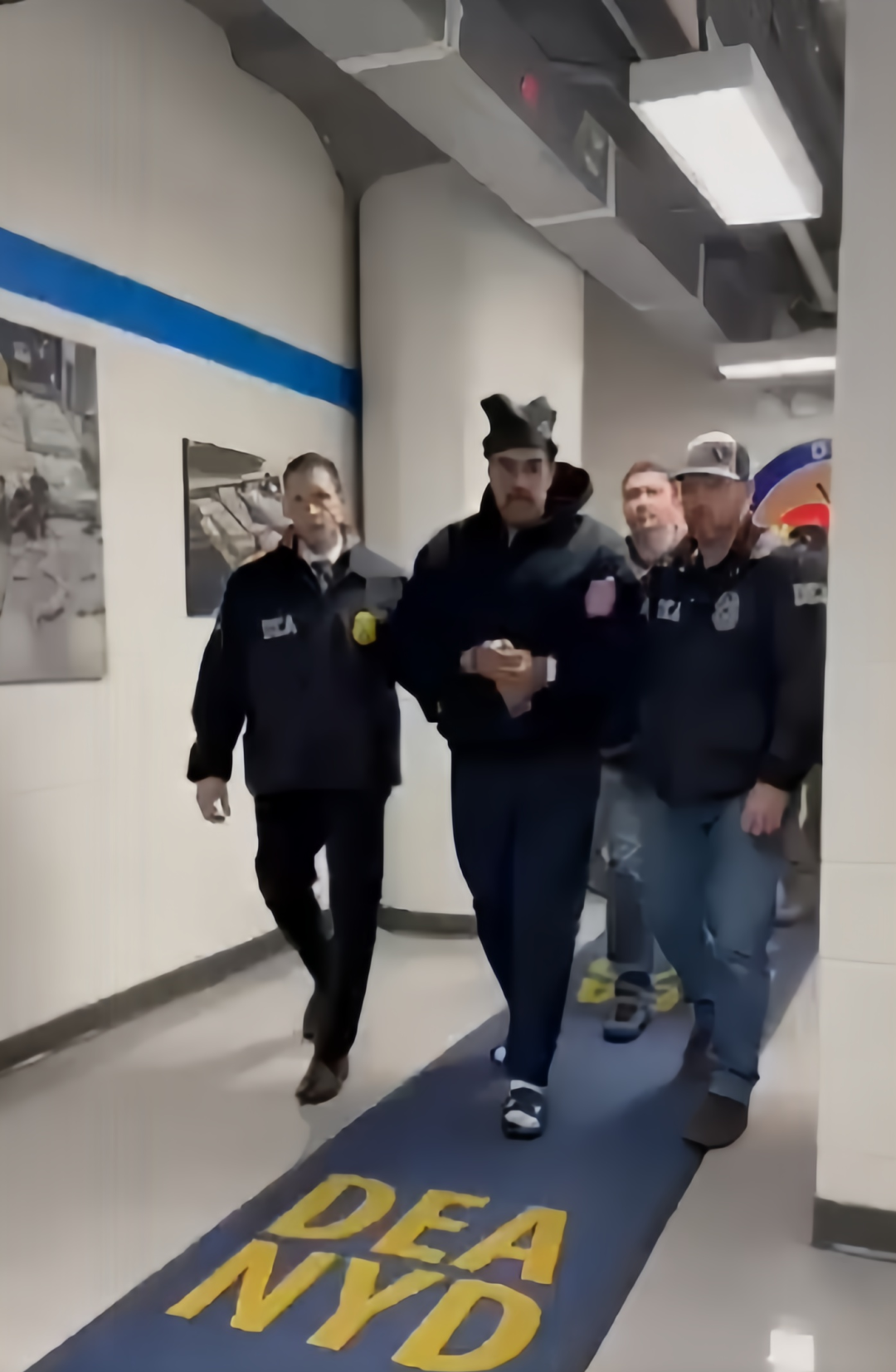 之后,美国白宫“快速反应小组”官方X账号突然发布了马杜罗在美国纽约禁毒署内的视频。视频中,身材高大的马杜罗身着黑色帽衫,被两名魁梧的美国工作人员架着走在走廊里。他看上去情绪稳定,还礼貌地向身旁的人员打招呼:“晚上好!新年快乐!”