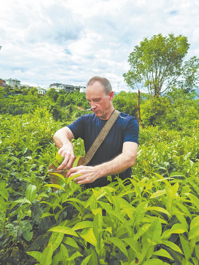 Richard Bales picks tea leaves in Yunnan province. [Photo provided to China Daily]