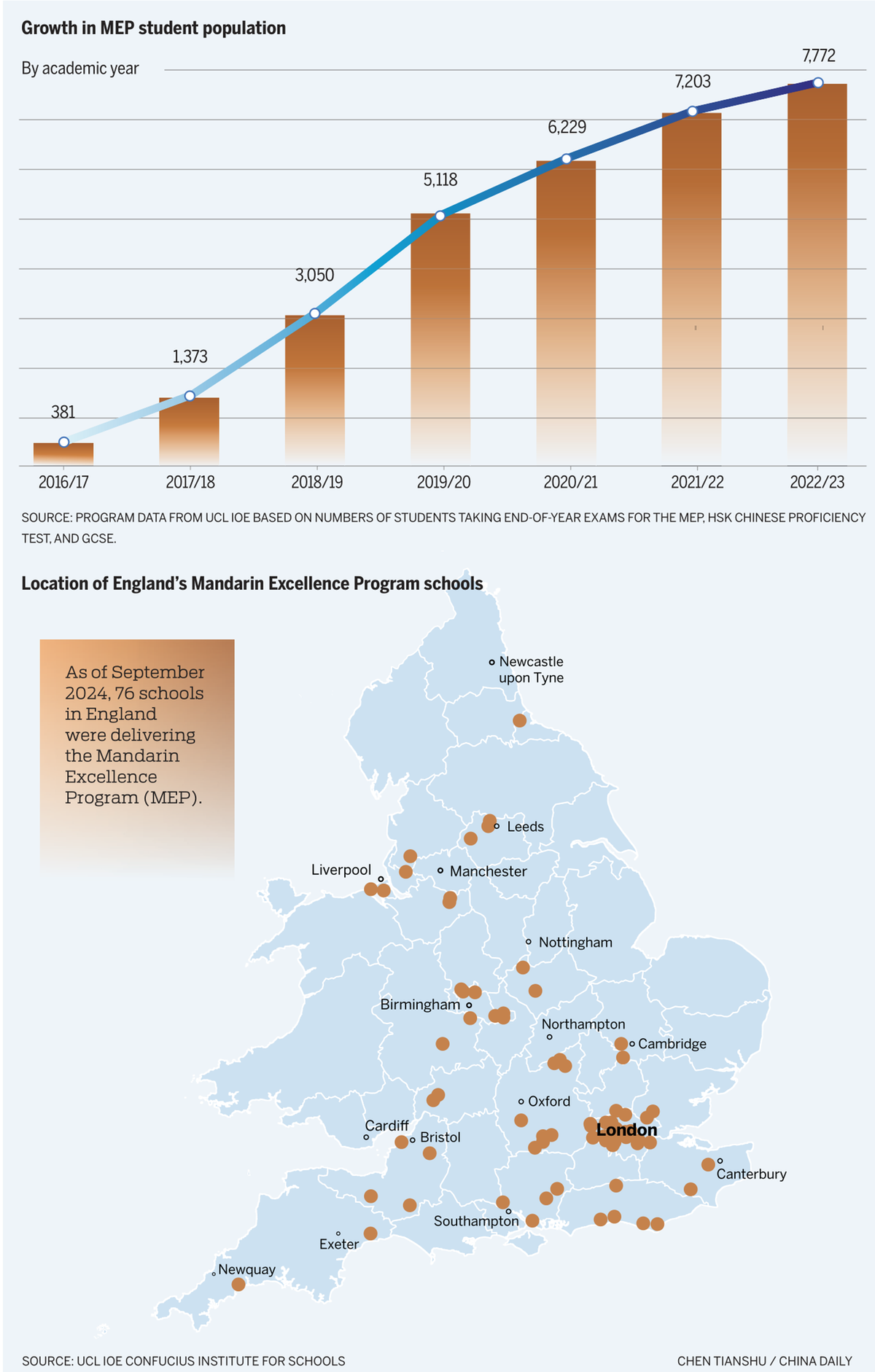 A September report by the British Council noted that Mandarin is one of the few languages to have "significantly increased" in provision during the past decade. Entries for the General Certificate of Secondary Education, or GCSE, in Mandarin, rose from a little more than 3,000 in the 2012-13 academic year to more than 7,800 in 2023-24.