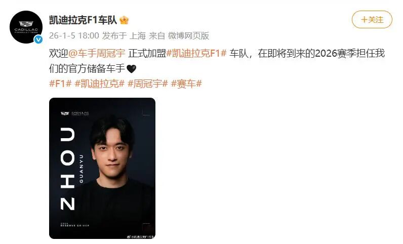 1月2日,法拉利车队官宣周冠宇离队,随后凯迪拉克更新社媒动态,晒出一张猫的眼睛的照片,眼睛里有数字24,图片左下角还写有2026年1月5日。并配文:眼神不会说谎,未来已然预料。暗示周冠宇即将加盟。