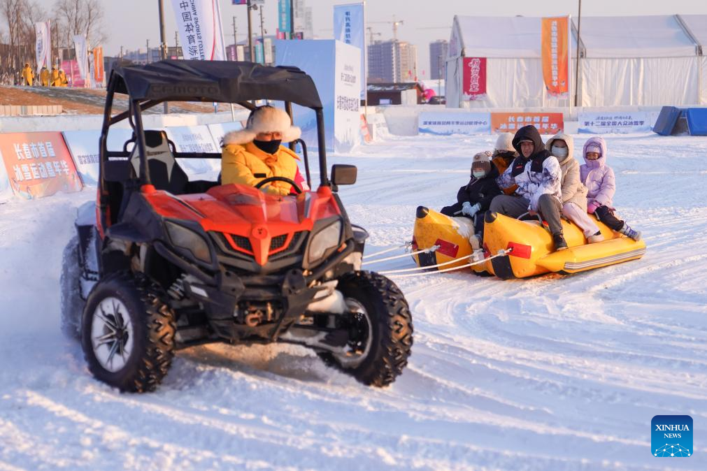 Tourists take a snow sleigh ride at a park in Changchun, northeast China's Jilin Province, Jan. 5, 2026. Changchun has set up a variety of distinctive ice and snow landscapes throughout urban areas this winter to lure tourists and encourage consumption. (Xinhua/Xu Chang)