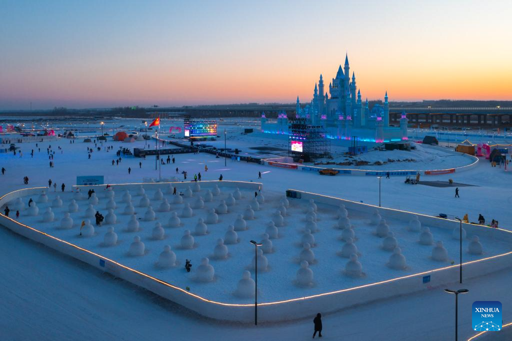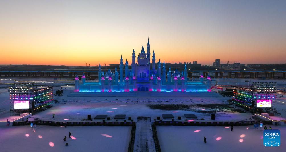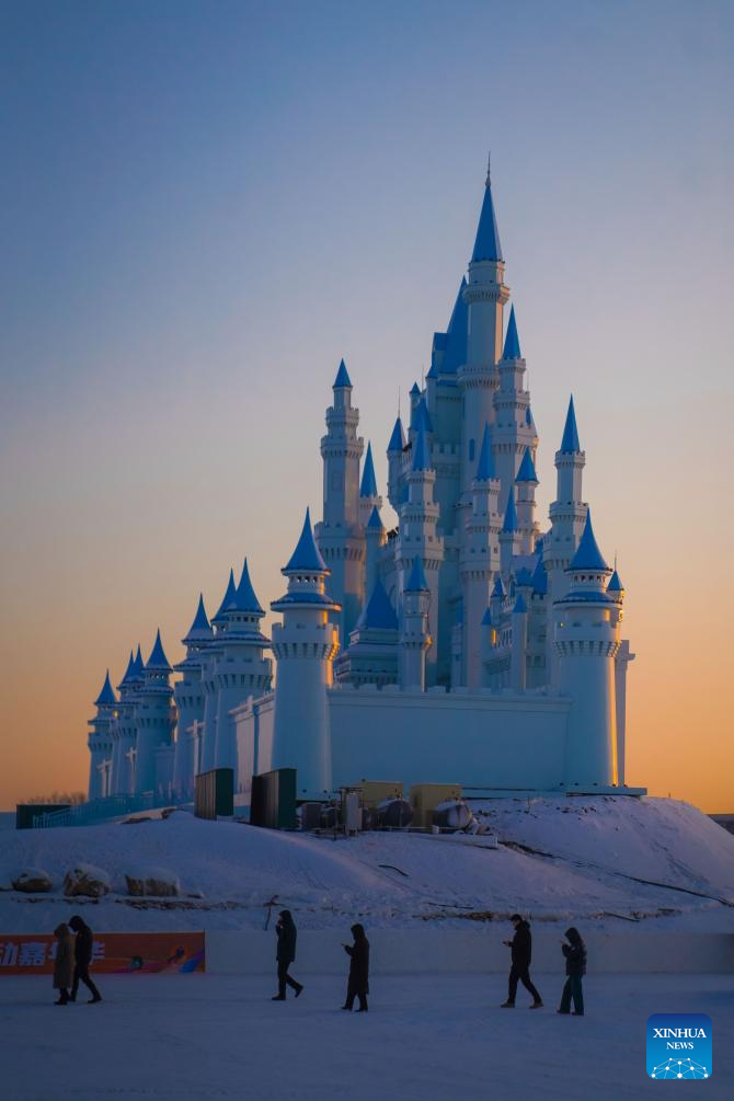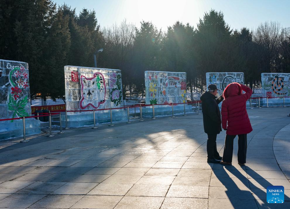 Tourists view ice-made art installations at a park in Changchun, northeast China's Jilin Province, Jan. 5, 2026. Changchun has set up a variety of distinctive ice and snow landscapes throughout urban areas this winter to lure tourists and encourage consumption. (Xinhua/Yan Linyun)