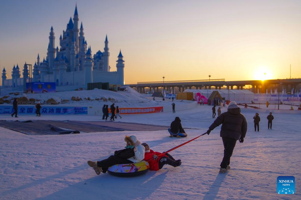 Tourists play at a park in Changchun, northeast China's Jilin Province, Jan. 5, 2026. Changchun has set up a variety of distinctive ice and snow landscapes throughout urban areas this winter to lure tourists and encourage consumption. (Xinhua/Xu Chang)