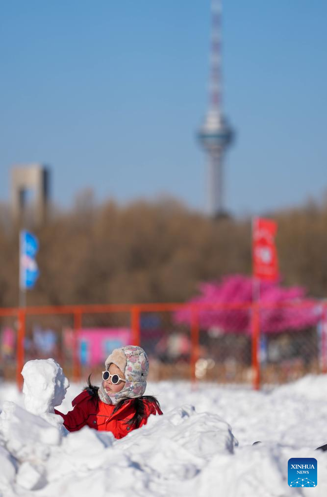 A child builds a snowman at a park in Changchun, northeast China's Jilin Province, Jan. 5, 2026. Changchun has set up a variety of distinctive ice and snow landscapes throughout urban areas this winter to lure tourists and encourage consumption. (Xinhua/Yan Linyun)