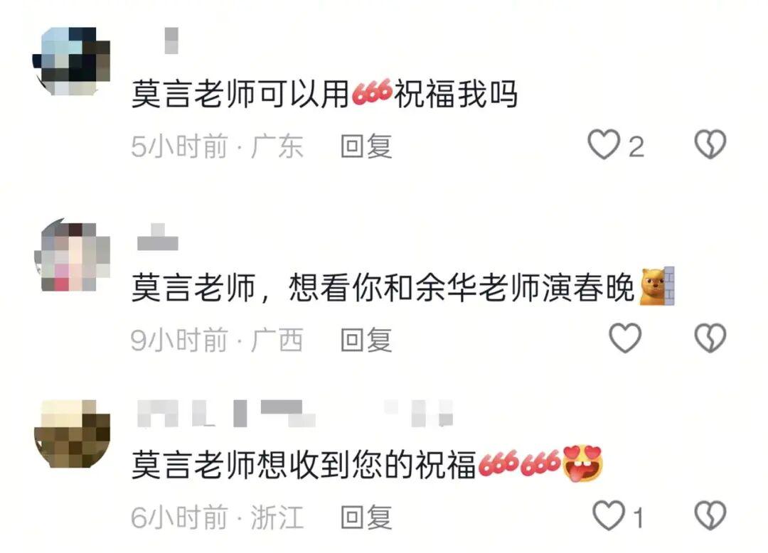 余华账号评论区走红的同时,大家也联想起另一位作家莫言,他同样在短视频平台活跃。于是,大家又把余华的“新年祝福666”复制粘贴到莫言的评论区。