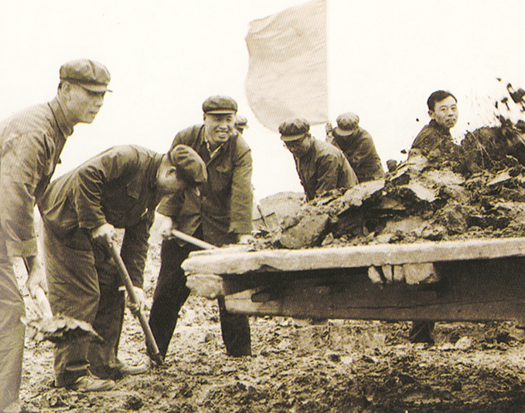 工地上,傅海宽等同志扛着铁锹与民工同吃同住;60多岁的大娘偷偷跑到工地给大家做饭,腰腿疼得厉害也不肯回去……肩挑手抬,一锹一锹,八万干部群众用双手挖希望之河。
