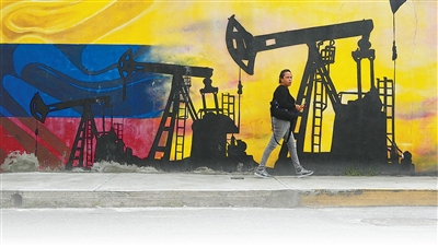 1月6日,委内瑞拉首都加拉加斯当地居民走过一幅绘有油泵和油井的壁画。