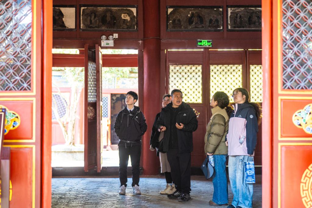 1月15日,杨志坚(右二)在白沙壁画博物馆大宝积宫为游客讲解。