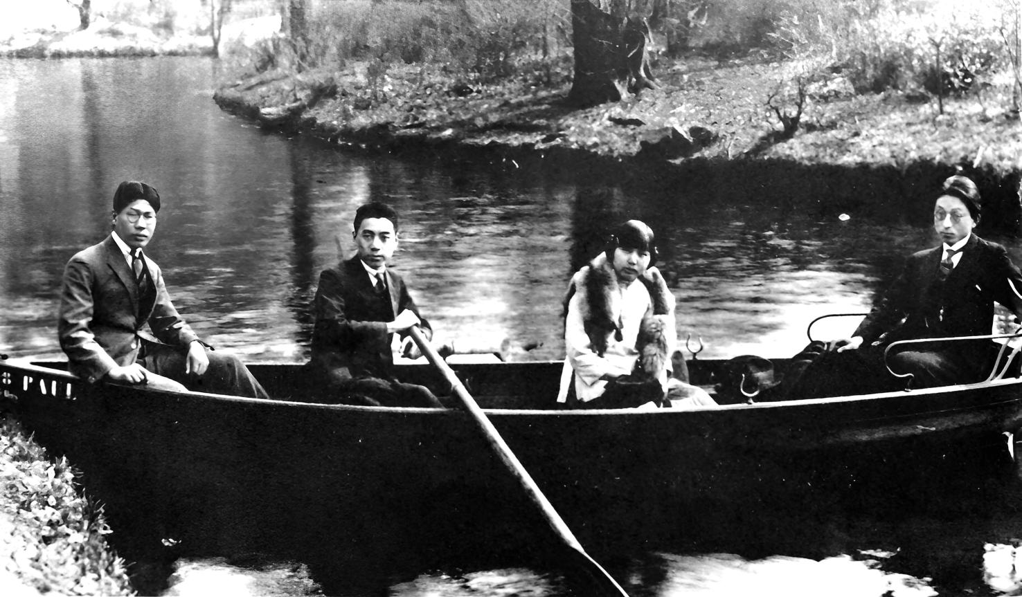 1922年,周恩来(左二)与张申府(右一)、刘清扬(右二)等人于德国柏林万赛湖游船上合影。(中央文献出版社《周恩来》)