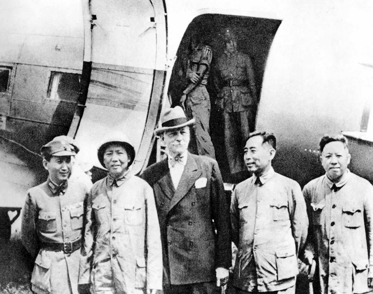 1945年8月28日下午,伴随着一阵巨大轰鸣,一架飞机在重庆九龙坡机场缓缓降落。“没有口号,没有鲜花,没有仪仗队,几百个爱好民主自由的人士却都知道这是维系中国目前及未来历史和人民幸福的一个喜讯……第一个出现在门口的是周恩来……毛泽东先生,五十二岁,灰色通草帽,灰蓝色的中山服,蓄发,似乎与惯常见的肖像相似,衣服宽大得很。”《大公报》当时这样报道。