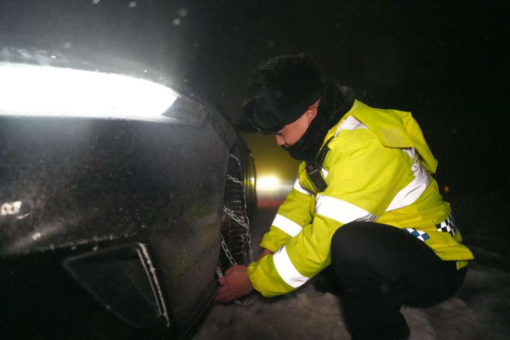 巴东县公安局绿葱坡派出所副所长甘方尧和同事们,发现一辆车因路面湿滑失控滞留在上坡路段。没有丝毫迟疑,他们蹲在结冰路面上为车辆加装防滑链,然后合力将受困车辆推离危险区域。