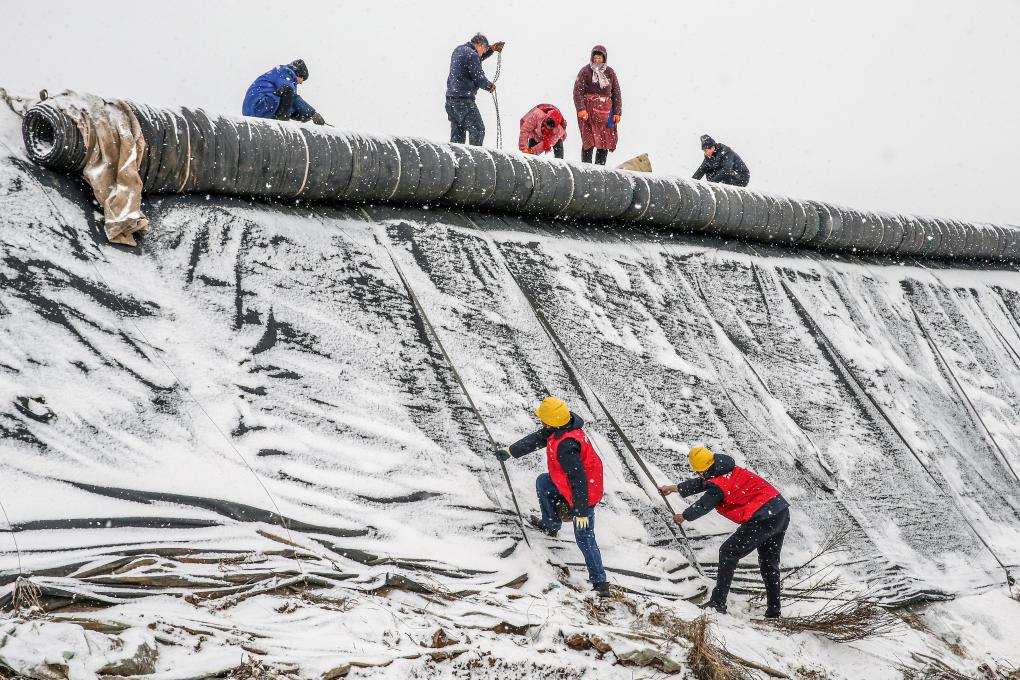1月19日,在河南省焦作市博爱源蔬菜专业合作社,辖区供电职工帮助菜农对蔬菜大棚保暖棉被进行维护。新华社发(程全摄)