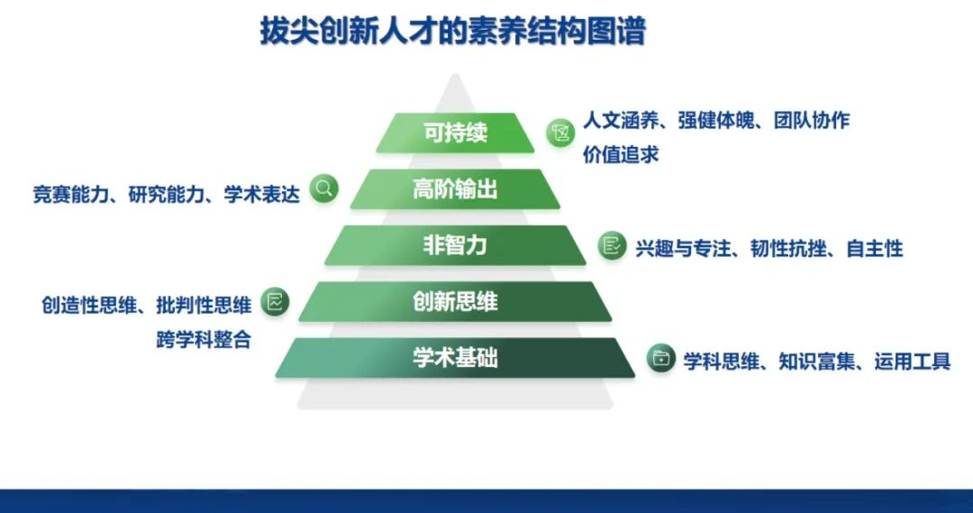 在课程与培养模式上,为了学生的全面、自主、个性和可持续发展,学校系统构建“三层五类卓越人才”课程体系,有利于放缓课程坡度、放慢课程进度、拓展课程宽度、加深课程深度。学校贯彻落实教育强国精神,特成立拔创早培中心,课程实施强调“理想信念为魂、全员普育为基、创新素养为本、特需课程为纲、贯通培养为径、弹性教学为策”的基本原则。