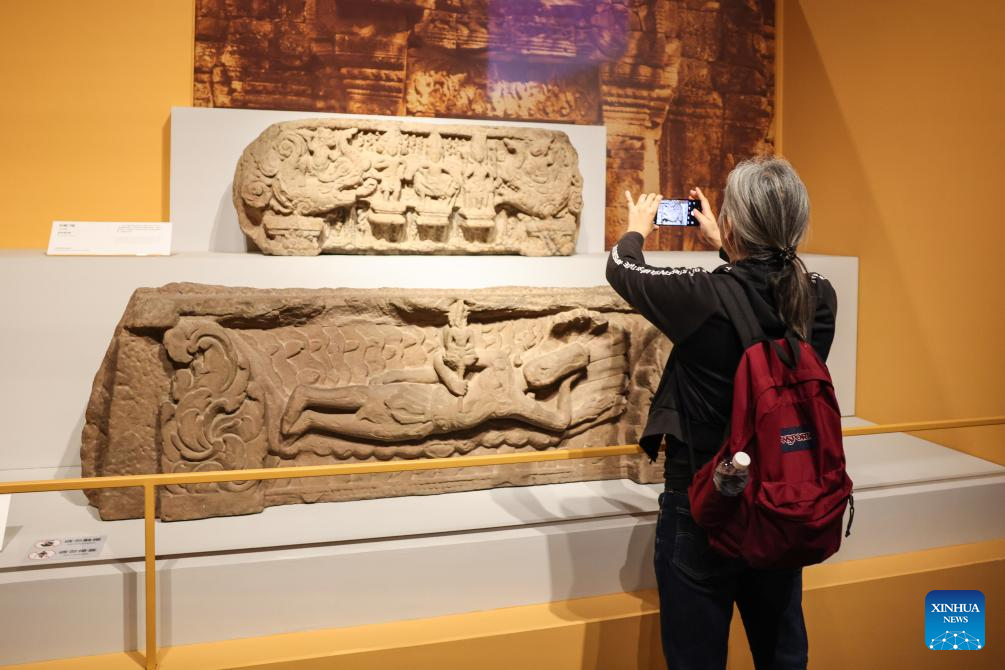 A man takes a photo of an exhibit during "The Epic of Water and Stone," an exhibition of Cambodia's ancient civilization, at China (Hainan) Museum of the South China Sea in Qionghai, south China's Hainan Province, Jan. 22, 2026. Co-hosted by China and Cambodia, the exhibition opened here in recent days, showcasing 122 pieces (sets) of exquisite cultural relics such as stone carvings and pottery from the National Museum of Cambodia. (Xinhua/Zhang Liyun)