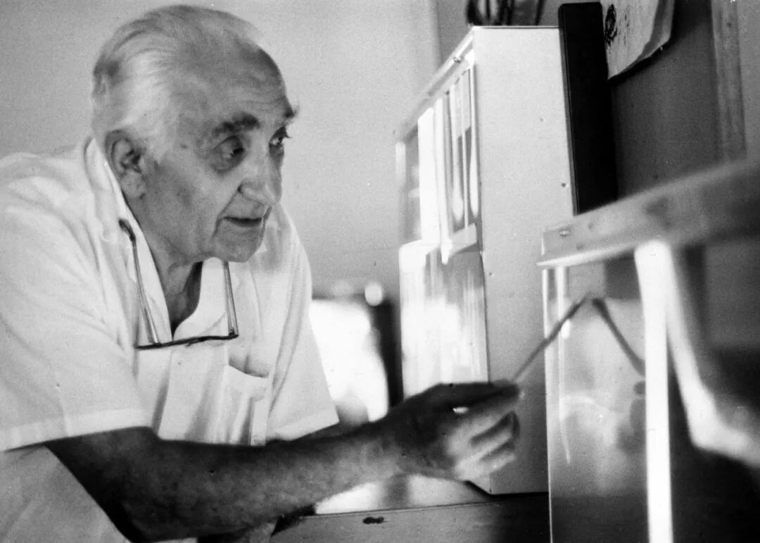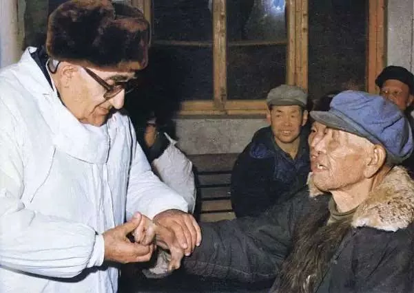 左图为马海德在延安窑洞前留影;右图为1980年,70岁高龄的马海德教授为小患者看病。