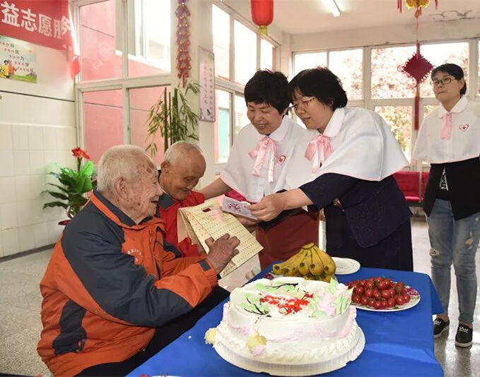 刘振华(右二)为麻风休养员过生日。2005年,她被授予南丁格尔奖章。