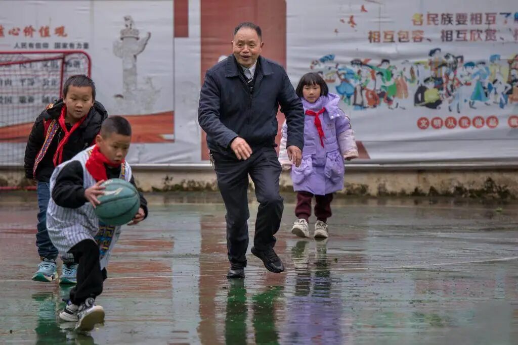 农加贵(右二)在落松地小学和孩子们一起玩耍。2017年,他被授予全国道德模范荣誉称号;2024年,他当选全国教书育人楷模。