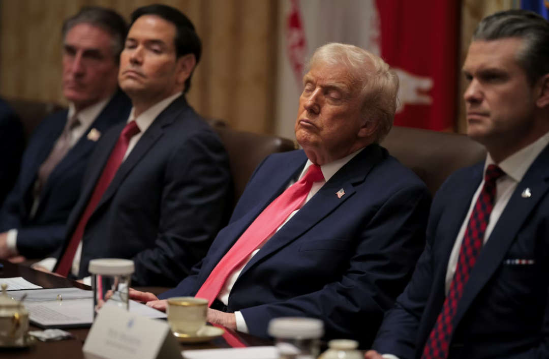 不过,近日一张特朗普在内阁会议上闭目养神的照片在社交媒体上疯传。画面中,特朗普深深地陷在皮椅里,在国务卿鲁比奥、国防部长海格塞斯、商务部长卢特尼克等人的环绕下,他闭着眼睛,不知道是在睡觉还是在养神。
