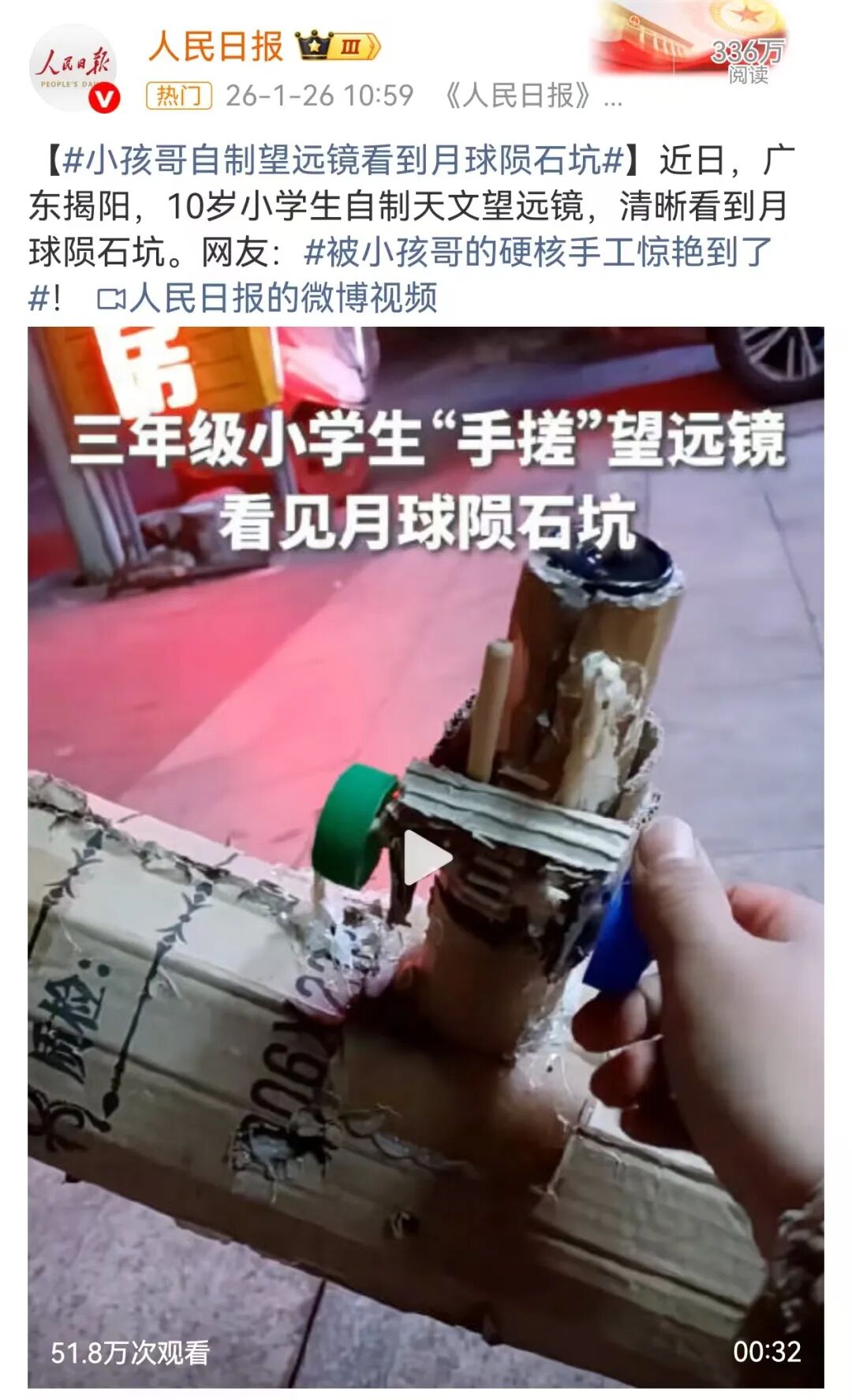据@人民日报 1月26日报道,近日,广东揭阳一名10岁小学生自制了一台天文望远镜,清晰看到了月球陨石坑。