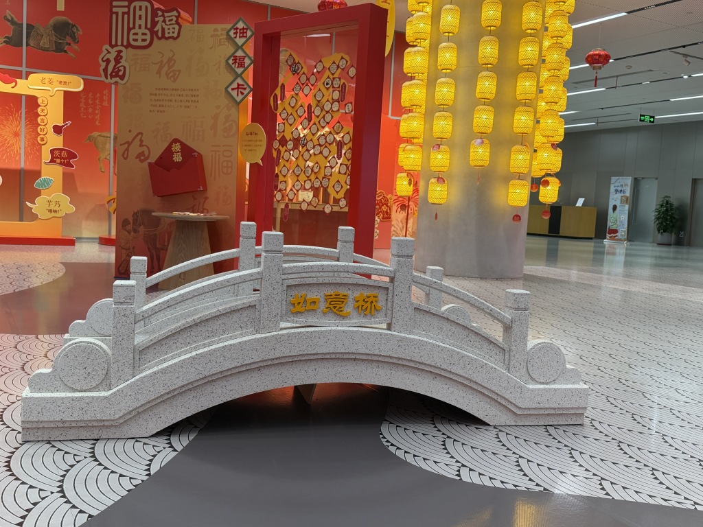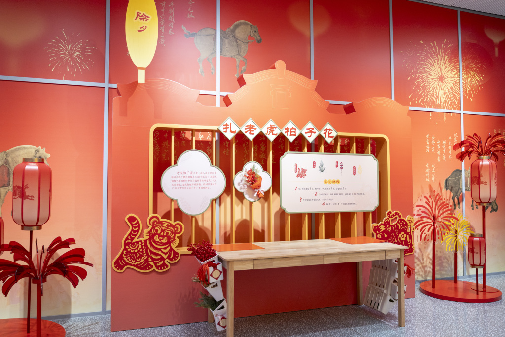 走出学术气息浓郁的主展区,“春节主题造景区”以丰富的互动场景吸引观众。 “猜腊八粥料”将不同杂粮做成实物拼图,观众可以拼出一份自己喜欢的腊八粥;“送灶王”场景将灶王爷设计成憨态可掬的卡通形象,邀请观众打卡留念;“扎老虎柏子花”里,观众可体验现场用柏叶、红果等材料制作仿生花;“抽福卡”“年画拓印”“接财神”“走三桥”等趣味互动装置,让市民在亲身体验中重拾地道上海年味。