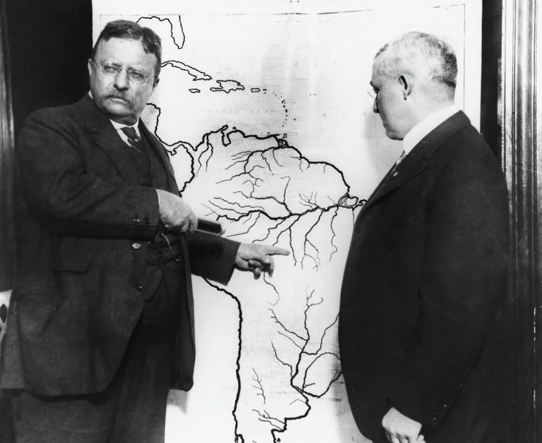 ·20世纪初,西奥多·罗斯福(左)指着一张拉美地图。(美国国会图书馆)