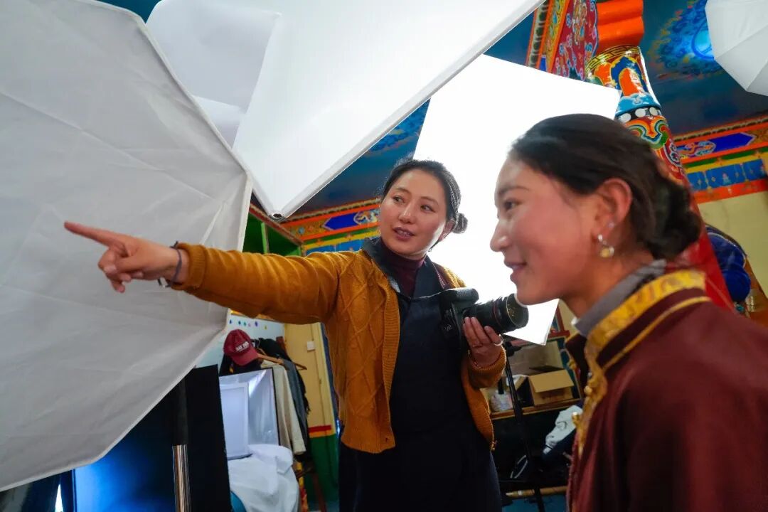 在“钦乐工坊”的摄影棚,达瓦卓玛(左)指导模特如何摆姿势拍摄品牌耳钉饰品。