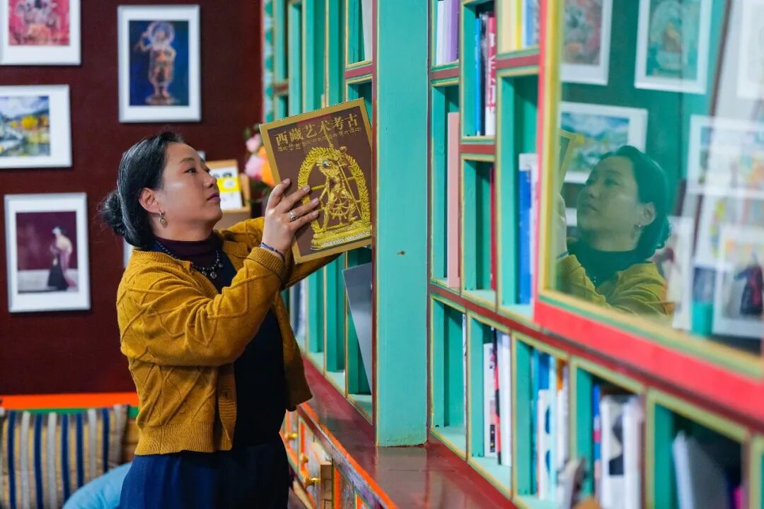达瓦卓玛在“钦乐民宿”公共空间整理提供给住客阅读的书籍。