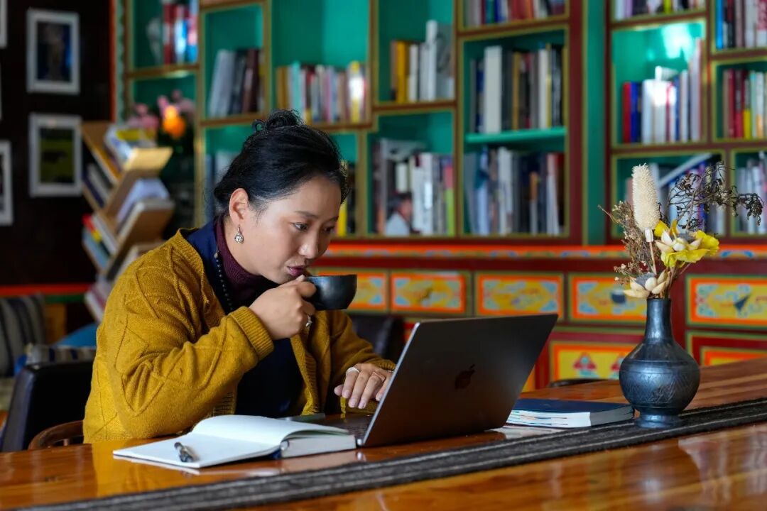 她还要核对工坊和民宿的账目,做一份商业计划书的培训PPT……手机不停地响,她一会儿用藏语和镇上的年轻人商量着创业培训,一会儿用普通话对接着上海的客户,一会儿用英语向客人解释她能提供的服务。