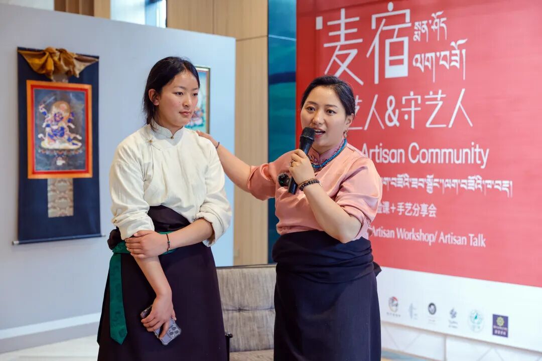 在四川省成都市宽窄巷子附近的皋月画廊举办的“麦宿集市”上,达瓦卓玛(右)向观众介绍麦宿年轻的手工艺者。