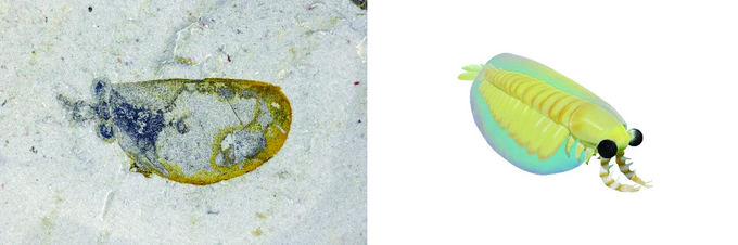 花垣生物群射齿类节肢动物——赫德虾类化石图(左)和复原图 新华社发