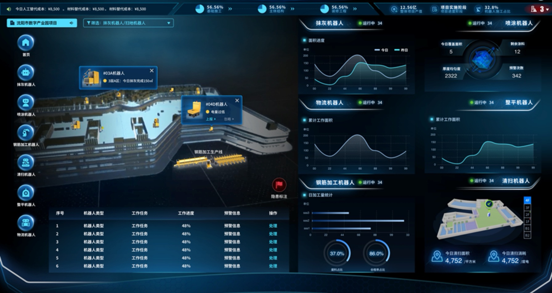 在项目工地上,运输机器人搭载着各类建材和小型设备往返穿梭,转运物资;焊接机器人在高空舞动“手臂”,自动完成焊接作业;喷涂机器人在室内“挥毫泼墨”,对着墙面自主进行粉刷作业;钢筋加工机器人不停运转,将钢筋精准折弯成形。工地一旁的电子大屏上,实时显示着每个机器人的运转状态,工作人员只需点击鼠标下达命令,即可让整个“机器人军团”协调配合、完成各项施工任务……